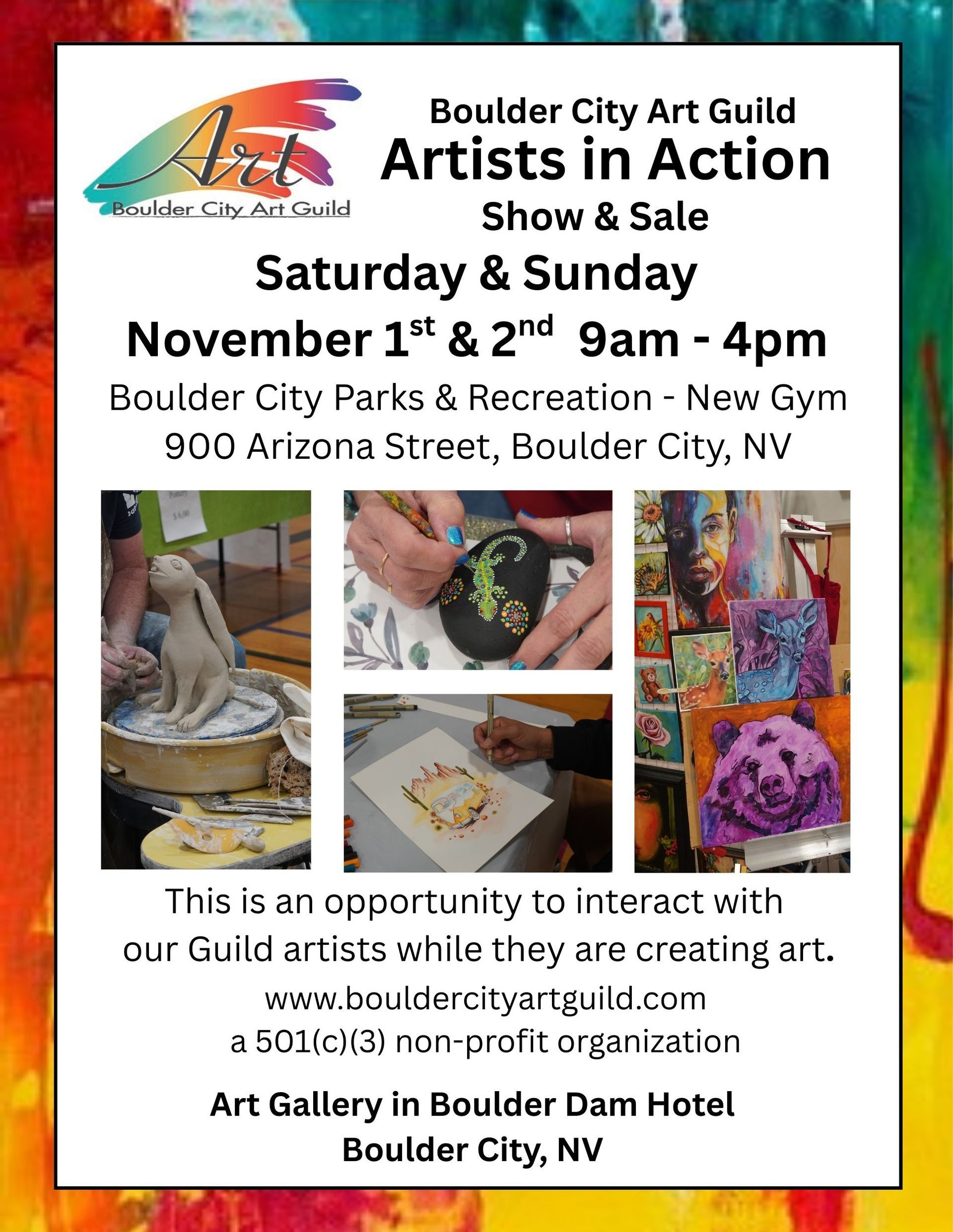 Boulder City Art Guild member artists will be working in various mediums, each ready to engage with you and share insights into their creative processes and techniques; painting, sculpting, and creating right before your eyes. Discover how each piece comes to life, meet the makers. A celebration of creativity you won’t want to miss!